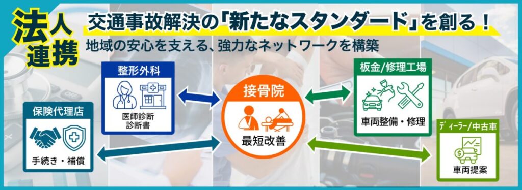 当協会が提唱する「法人連携サポート」は、接骨院を地域における健康と安心の「ハブ(拠点)」として、整形外科、保険代理店、自動車関連企業が強固に結びつくネットワークです。