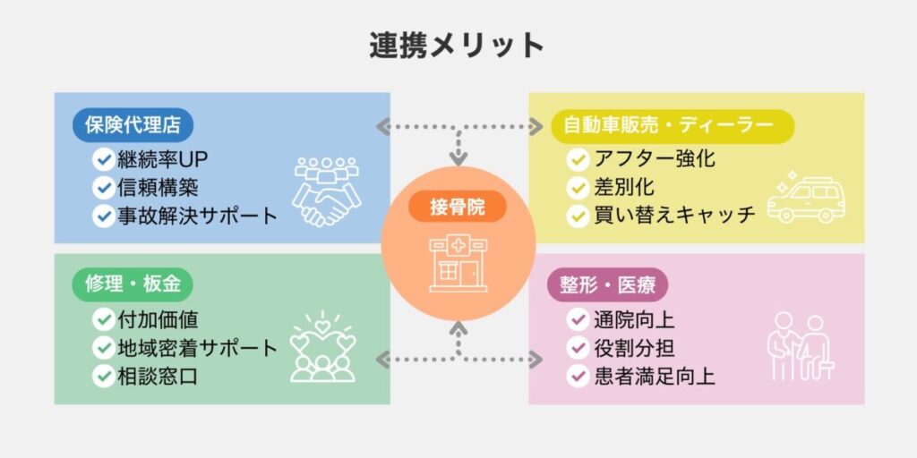 • 財産のケア(接骨院 ⇄ ディーラー・修理工場): 車両の破損による不便を解消するため、信頼できる自動車専門家を繋ぎます。