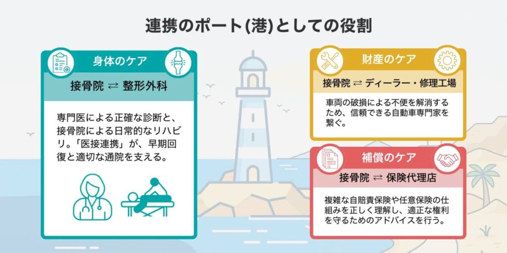 • 補償のケア(接骨院 ⇄ 保険代理店): 複雑な自賠責保険や任意保険の仕組みを正しく理解し、適正な権利を守るためのアドバイスを行います。