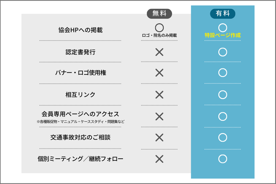 当協会ホームページは交通事故分野に特化した専門ポータルサイトです。その中でご紹介することで、交通事故対応に強い院としての専門性や信頼性を対外的に示すことができ、ブランド価値の向上にもつながります。