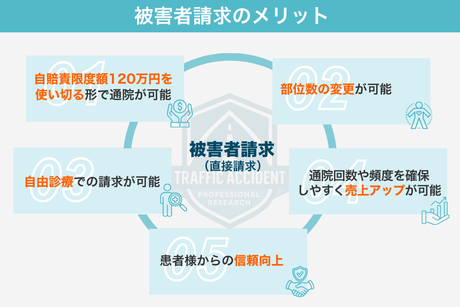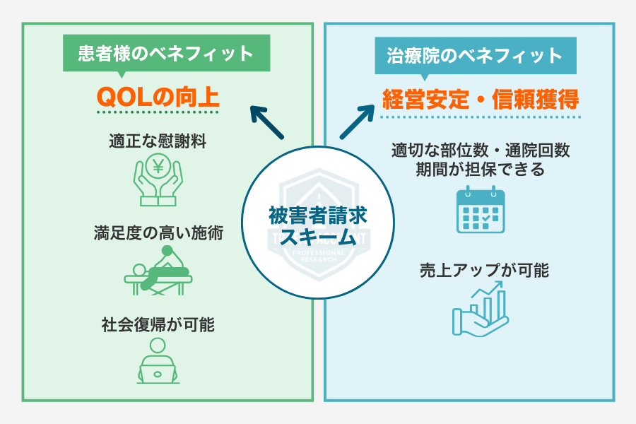 本図は「被害者請求スキーム」によって生まれる、患者様と治療院双方のメリットを示しています。患者様にとっては、適正な慰謝料の確保につながり、経済的不安を軽減しながら安心して通院が可能となります。その結果、満足度の高い施術を受けられ、QOL(生活の質)の向上や早期の社会復帰が期待できます。一方、治療院側にとっても、適切な部位数や通院回数・期間を担保しやすくなり、正当な評価と対価を得ることが可能です。これにより経営の安定や信頼獲得、さらには売上向上にもつながります。被害者請求スキームは、患者様と治療院がともに適正な形で支え合い、最良の結果を目指す仕組みです。