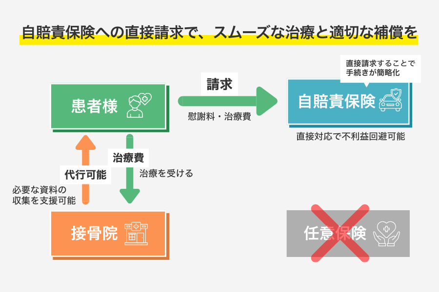 自賠責保険へ直接請求する仕組みについて解説いたします。患者様が自賠責保険へ慰謝料や治療費を直接請求することで、手続きが簡略化され、スムーズな治療継続が可能となります。接骨院では治療の提供に加え、必要書類の収集や申請手続きのサポート・代行にも対応可能です。これにより、患者様は治療に専念しながら、適切な補償を受けることができます。また、任意保険会社を介さず直接対応することで、不利益の回避にもつながります。安心して通院できる環境づくりをサポートする仕組みです。