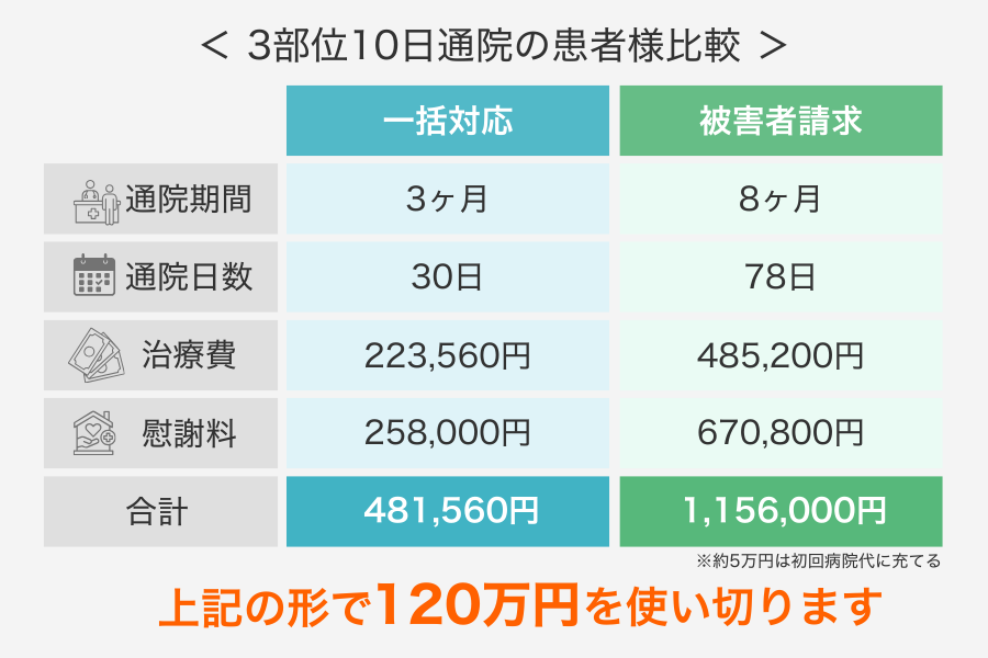 自賠責限度額120万円を使い切る形で通院可能(3部位で約80日)