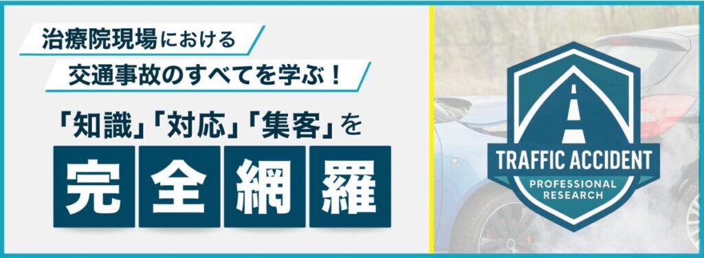 交通事故の知識、保険制度、被害者請求、加害者対応、整形外科との連携、部位交渉、集客導線づくりまで、